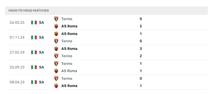 - Kèo tỷ số H2 Roma vs Torino: 2-0