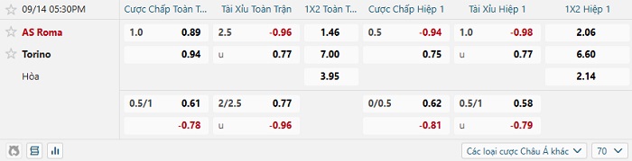 Hiện tại, nhà cái niêm yết cho Roma mức chấp -1 là hoàn toàn chính xác và họ đủ sức thắng kèo trước đối thủ. Trong 5 lần gặp nhau gần nhất của hai đội, Roma đã bất bại với 4 chiến thắng và 1 hòa kèo. Trong khi đó thì 10 trận đã qua của Torino đã khép lại mà họ chỉ thắng kèo 2, thua đến 8. Do đó, kèo châu Á trận đấu hôm nay sẽ có Roma là lựa chọn đầu tư an toàn nhất dành cho người hâm mộ.