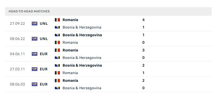 Lịch sử đối đầu Romania vs Bosnia & Herzegovina
