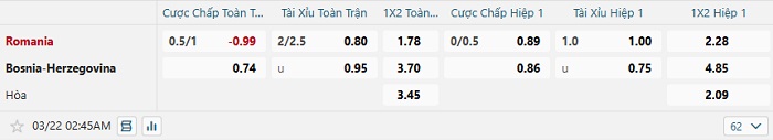 Bảng tỷ lệ kèo bóng đá Romania vs Bosnia & Herzegovina