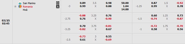 Bảng tỷ lệ kèo bóng đá San Marino vs Romania