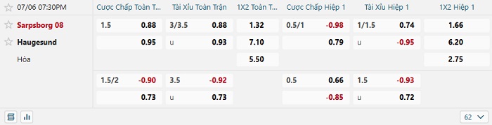 Bảng tỷ lệ kèo bóng đá hôm nay Sarpsborg vs Haugesund