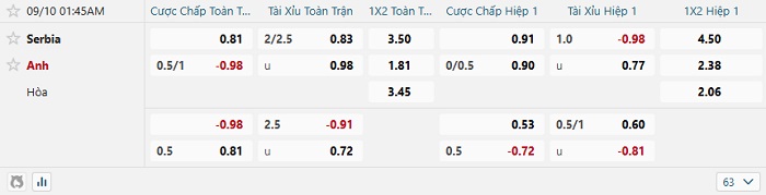 - Kèo tỷ số H1 Serbia vs Anh: 0-1
