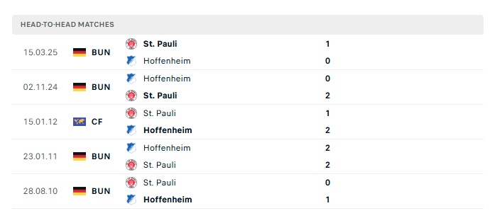 Lịch sử đối đầu St. Pauli vs Hoffenheim