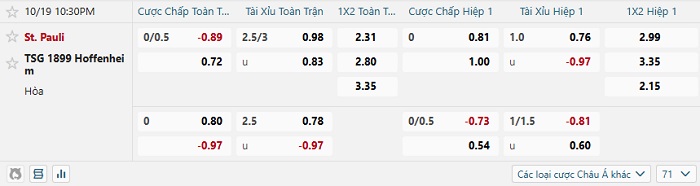 - Kèo tỷ số H1 St. Pauli vs Hoffenheim: 0-0
