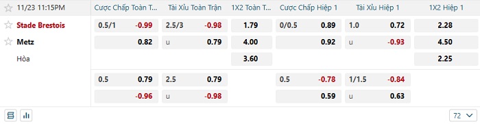 - Kèo tỷ số H1 Stade Brestois vs Metz: 0-0