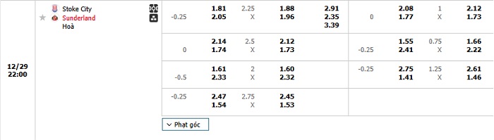 Bảng tỷ lệ kèo bóng đá Stoke City vs Sunderland