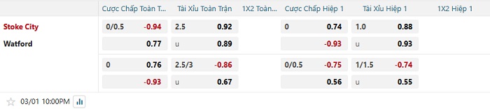 Bảng tỷ lệ kèo bóng đá Stoke City vs Watford
