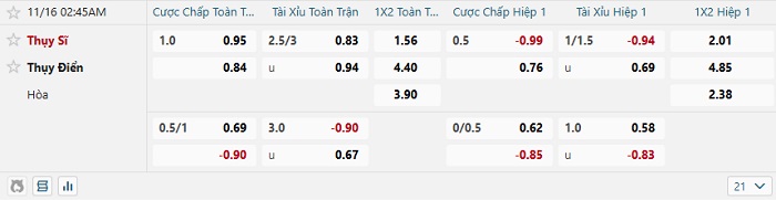 • Kèo tỷ số H1 Thụy Sỹ vs Thụy Điển: 1-0