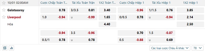 Tip kèo Châu Á hiệp 1 Galatasaray vs Liverpool