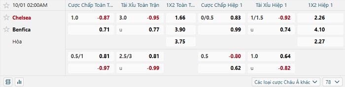 Tip kèo Châu Á hiệp 1 Chelsea vs Benfica