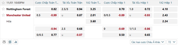 Tip kèo Châu Á hiệp 1 Nottingham vs Man United