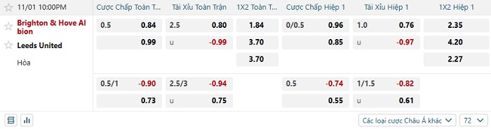 Tip kèo Châu Á hiệp 1 Brighton vs Leeds