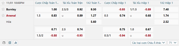 Tip kèo Châu Á hiệp 1 Burnley vs Arsenal