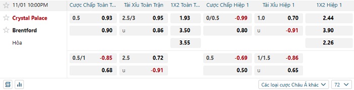 Tip kèo Châu Á hiệp 1 Crystal Palace vs Brentford
