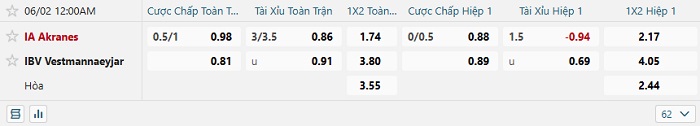 Tip kèo Châu Á hiệp 1 Akranes vs Vestmannaeyjar