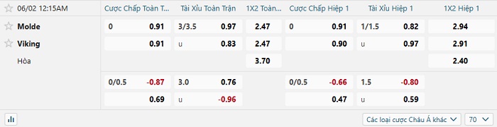 Tip kèo Châu Á hiệp 1 Molde vs Viking
