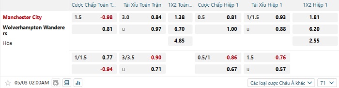 Tip kèo Châu Á hiệp 1 Man City vs Wolves