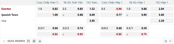 Tip kèo Châu Á hiệp 1 Everton vs Ipswich
