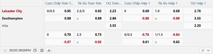 Tip kèo Châu Á full trận Leicester vs Southampton