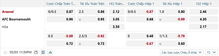 Tip kèo Châu Á full trận Arsenal vs Bournemouth