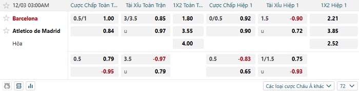 Tip kèo Châu Á full trận Barcelona vs Atletico Madrid