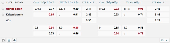 Tip kèo Châu Á hiệp 1 Hertha Berlin vs Kaiserslautern