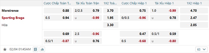 Tip kèo Châu Á hiệp 1 Moreirense vs Braga