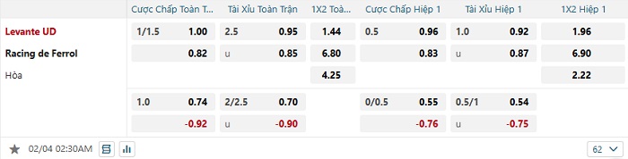 Tip kèo Châu Á hiệp 1 Levante vs Racing Ferrol