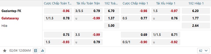 Tip kèo Châu Á hiệp 1 Gaziantep vs Galatasaray