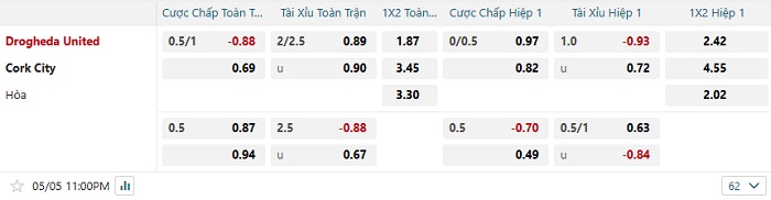 - Dự đoán tỷ số hiệp 1: Drogheda 1 – 0 Cork City