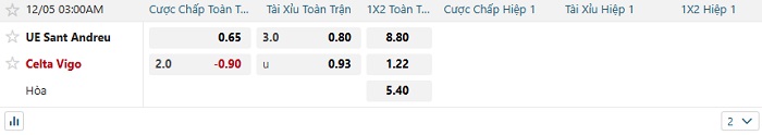 Tip kèo Châu Á full trận Sant Andreu vs Celta Vigo