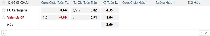 Tip kèo Châu Á hiệp 1 Cartagena vs Valencia