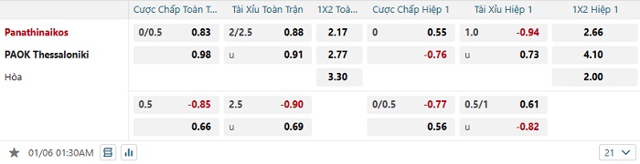 Nhận định trận đấu Panathinaikos vs PAOK: Đang có phong độ thi đấu cực cao, PAOK ngày hôm nay có đủ sự tự tin để đánh bại PAOK ngay trên sân của đối thủ. Nên biết rằng ở mức chấp châu Á +1/4, đội khách đang là lựa chọn đầu tư vàng. Việc đội khách thi đấu quá an toàn sẽ khiến cho trận đấu hôm nay không có nhiều hơn 2 bàn thắng được ghi.