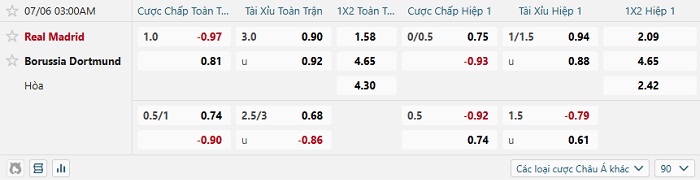 Tip kèo Châu Á full trận Real Madrid vs Dortmund