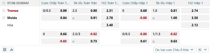 Tip kèo Châu Á hiệp 1 Tromso vs Molde