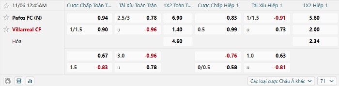Tip kèo Châu Á full trận Pafos vs Villarreal