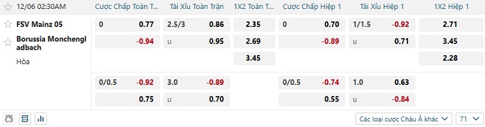 - Dự đoán tỷ số hiệp 1: Mainz 0 – 0 Monchengladbach