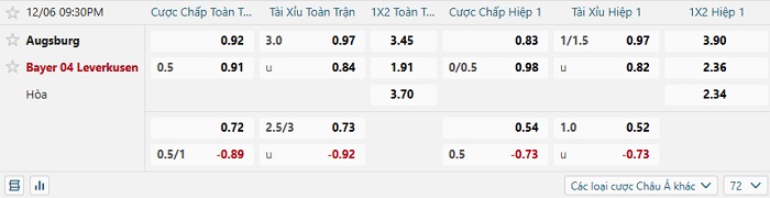 Tip kèo Châu Á full trận Augsburg vs Bayer Leverkusen