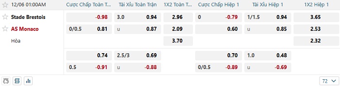 Tip kèo Châu Á full trận Brest vs Monaco