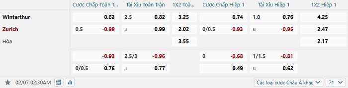 Tip kèo Châu Á full trận Winterthur vs Zurich