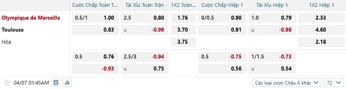 Tip kèo Châu Á full trận Marseille vs Toulouse
