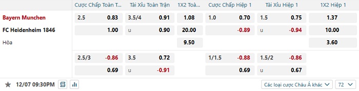 Tip kèo Châu Á hiệp 1 Bayern Munich vs Heidenheim