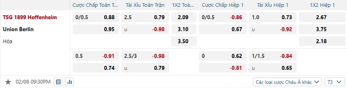Tip kèo Châu Á hiệp 1 Hoffenheim vs Union Berlin