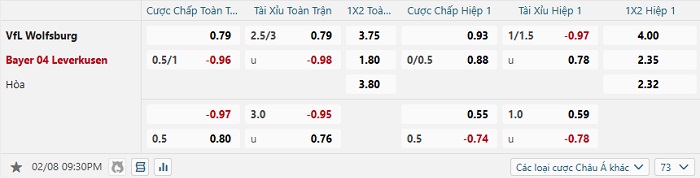 Tip kèo Châu Á full trận Wolfsburg vs Bayer Leverkusen