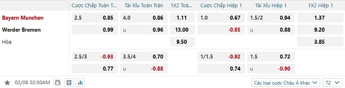 Tip kèo Châu Á full trận Bayern Munich vs Werder Bremen