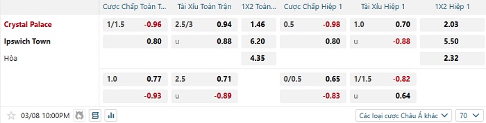 Tip kèo Châu Á hiệp 1 Crystal Palace vs Ipswich