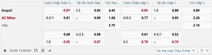 Tip kèo Châu Á full trận Empoli vs AC Milan