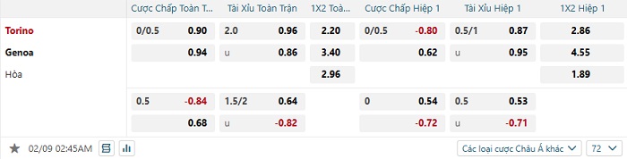 Tip kèo Châu Á hiệp 1 Torino vs Genoa