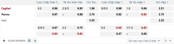 Tip kèo Châu Á hiệp 1 Cagliari vs Parma